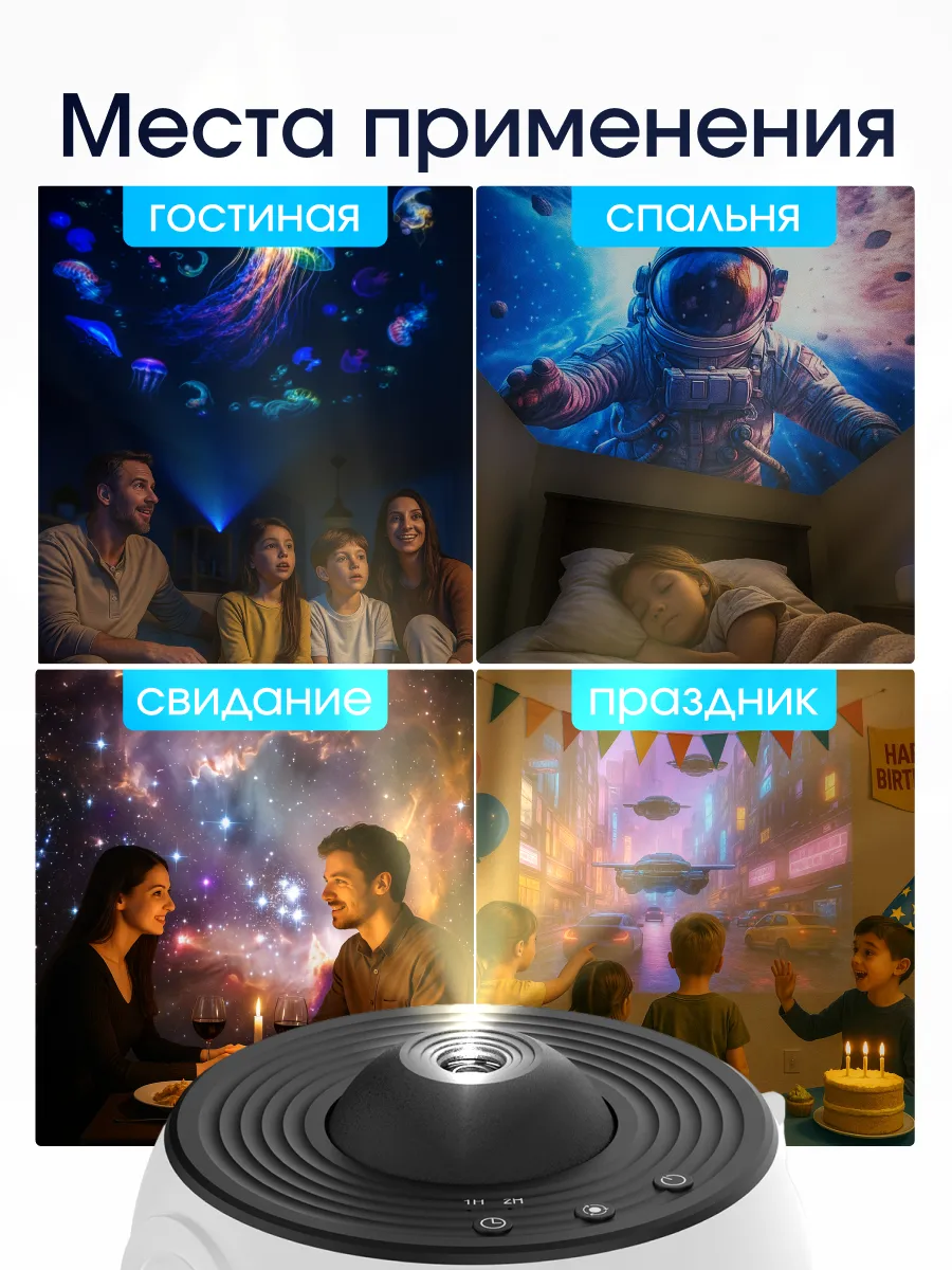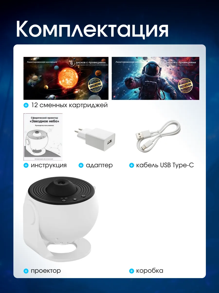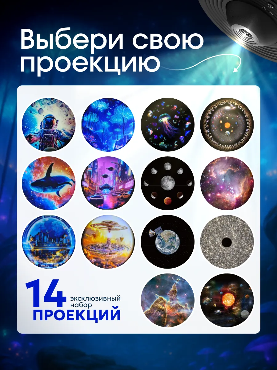 Проектор планетарий создает потрясающую реалистичную проекцию звездного неба на потолке вашей комнаты. В комплекте 13 сменных картриджей с изображениями планет, галактик и космических объектов. Три режима работы позволяют создать идеальную атмосферу для детской комнаты, романтического вечера или медитации. Простое управление и настройка резкости делают использование максимально удобным.