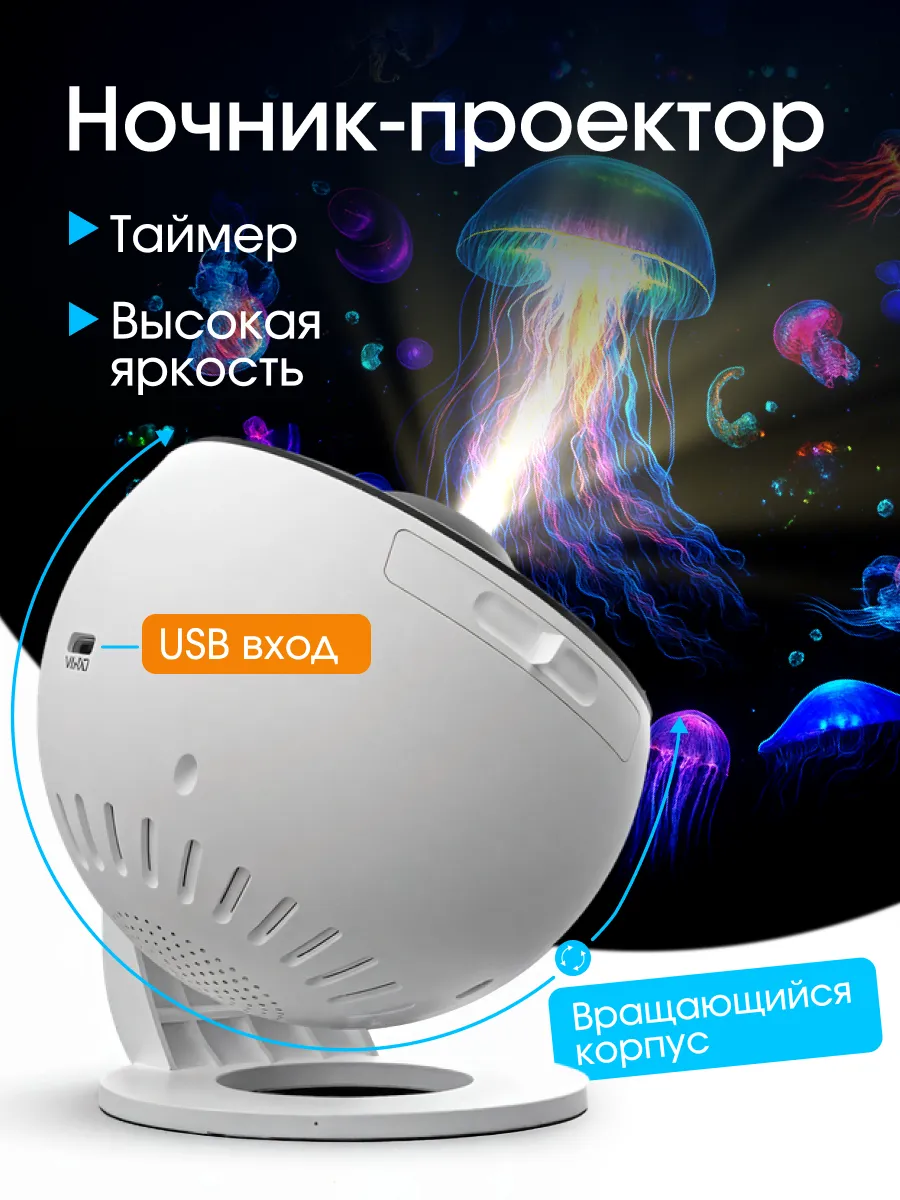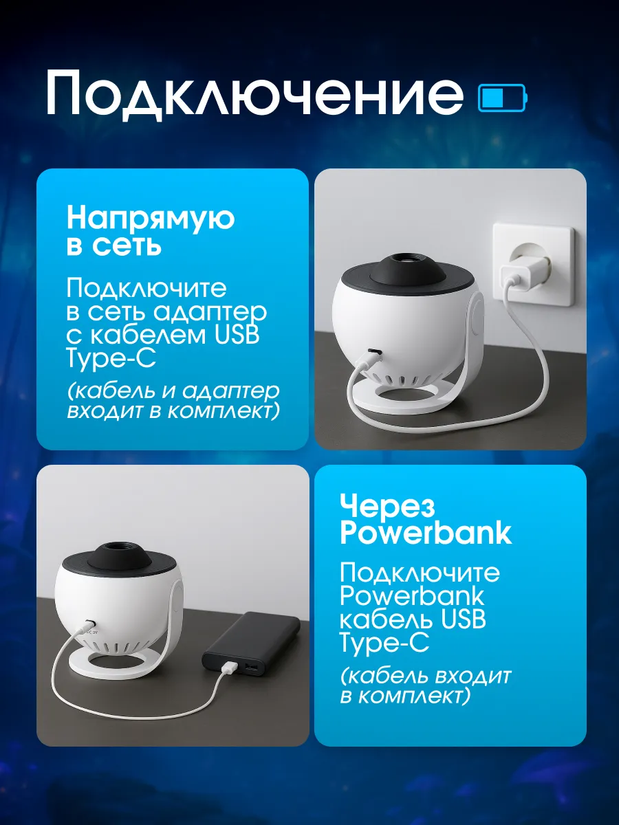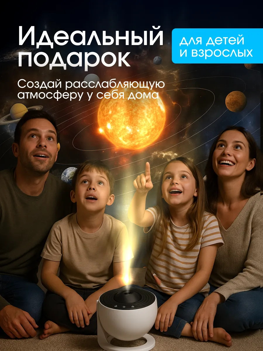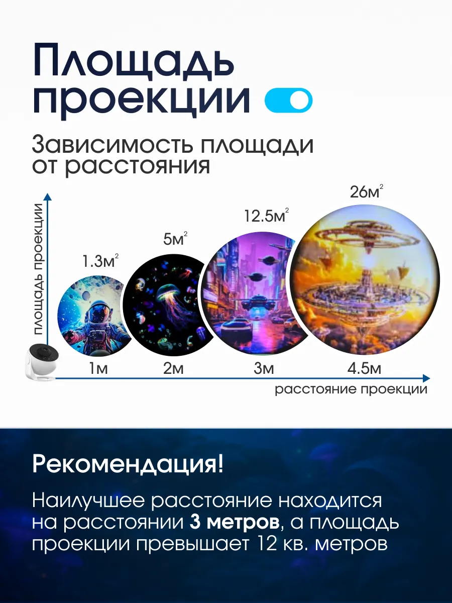Проектор планетарий создает потрясающую реалистичную проекцию звездного неба на потолке вашей комнаты. В комплекте 13 сменных картриджей с изображениями планет, галактик и космических объектов. Три режима работы позволяют создать идеальную атмосферу для детской комнаты, романтического вечера или медитации. Простое управление и настройка резкости делают использование максимально удобным.